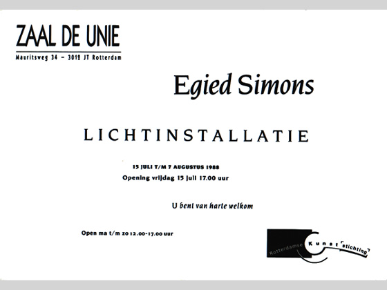 Persbericht De Rotterdamse Kunststichting presenteert van 15 juli t/m 7 augustus in Zaal De Unie een lichtinstallatie van Egied Simons. Egied Simons (1958) is in 1987 afgestudeerd aan de Academie voor Beeldende Kunst te Rotterdam. In zijn werk onderzoekt hij begrippen als begrenzing en ontgrenzing, afstand en standpunt, werkelijke en imaginaire ruimte. Dit voornamelijk met behulp van fotografie en video. Zijn fotowerken zijn eerder geëxposeerd in de 'Herfstsalon' (1985) en in Galerie Westersingel 8. Naar aanleiding van zijn eindexamenwerk heeft de Rotterdamse Kunststichting hem - in het kader van het Ontwikkelings- en Stimulerings Fonds - een opdracht verstrekt. De lichtinstallatie in Zaal De Unie is daarvan het resultaat. De installatie bestaat uit 28 aluminium T.L.-bakken van een meter bij een meter, die gestapeld en naast elkaar geplaatst twee ruimtes vormen. Eén ruimte waarbij het licht naar binnen is gekeerd en een ruimte waarbij het licht naar buiten is gekeerd. Doordat de T.L.-bakken 'wanden' van licht vormen, ontstaat een andere ruimtelijke werking dan wanneer het licht vanuit één punt zou komen.