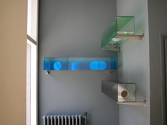 Semi-permanent display of three taper showcases in the window and one bookendshelf at the library in the basement.