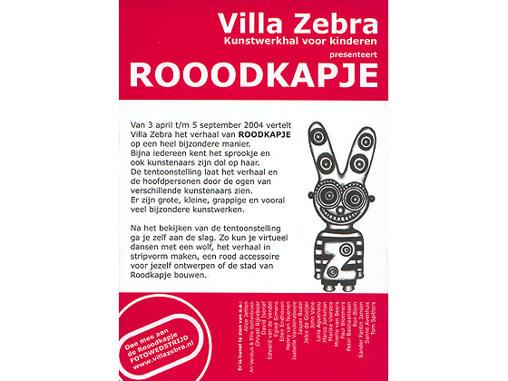 Van 3 april t/m 5 september 2004 vertelt Villa Zebra het verhaal van ROODKAPJE op een heel bijzondere manier. Bijna iedereen kent het sprookje en ook kunstenaars zijn dol op haar. De tentoonstelling laat het verhaal en de hoofdpersonen door de ogen van verschillende kunstenaars zien. Er zijn grote, kleine, grappige en vooral veel bijzondere kunstwerken. Na het bekijken van de tentoonstelling ga je zelf aan de slag. Zo kun je virtueel dansen met een wolf, het verhaal in stripvorm maken, een rood accessoire voor jezelf ontwerpen of de stad van Roodkapje bouwen. Er is kunst te zien van o.a.: