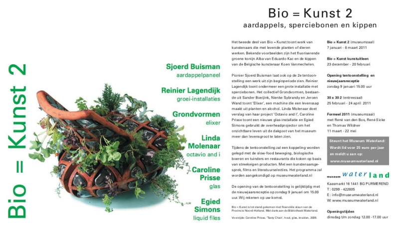 Pionier Sjoerd Buisman laat ook op de 2e tentoonstelling een werk uit zijn beginperiode zien. Reinier Lagendijk toont ondermeer een grote installatie met sperciebonen. Het collectief Grondvormen, bestaande uit Sander Boeijink, Nienke Sybrandy en Jeroen Wand toont ‘Elixer’, een machine die een levenssap maakt uit planten en alcohol. Linda Molenaar doet verslag van haar project ‘Octavio and I’, Caroline Prisse toont een nieuwe glas-installatie en Egied Simons gebruikt de overheadprojector om het onzichtbare leven uit de dakgoot van het museum meer dan levensgroot te laten zien.
