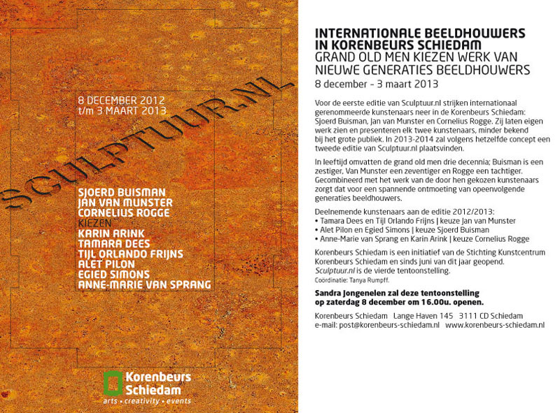 Voor de eerste editie van "Sculptuur.nl" strijken internationale gerenomeerde kunstenaars neer in de Korenbeurs Schiedam: Sjoerd Buisman, Jan van Munster en Cornelius Rogge. Zij laten eigen werk zien en presenteren elk twee kunstenaars, minder bekend bij het grote publiek. In 2013-2012 zal hetzelfde concept een tweede editie van 'Sculptuur.nl' plaatsvinden.