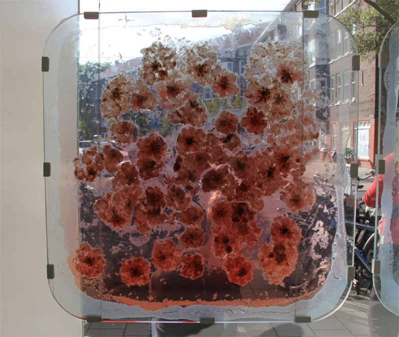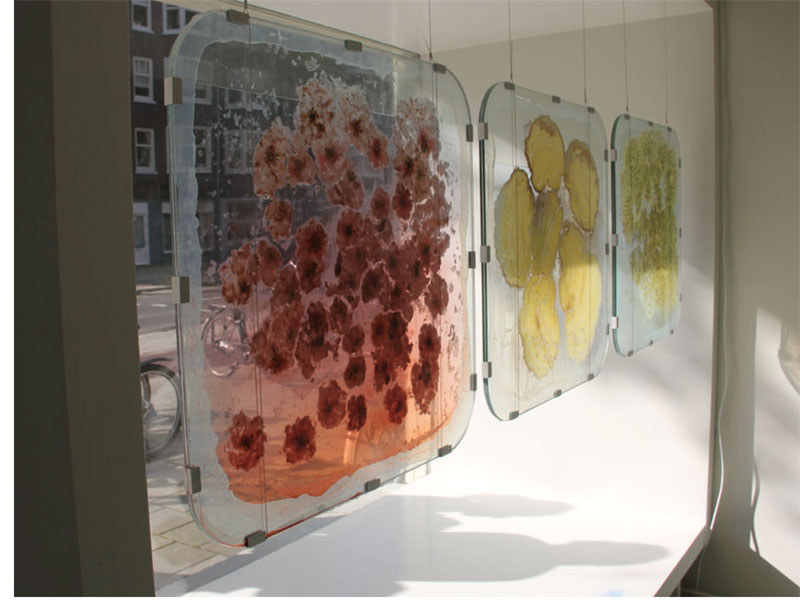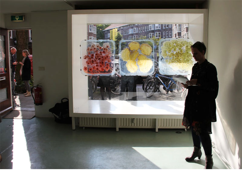 Soft fruits crushed between two sheets of glass, transformed from three to two dimensions. In Exploded View an overview of all existing contents of the fruits is shown.