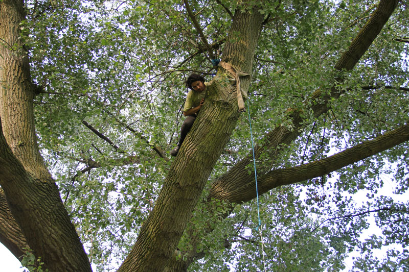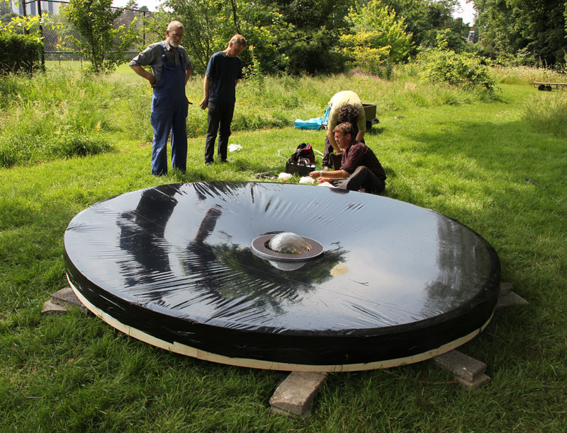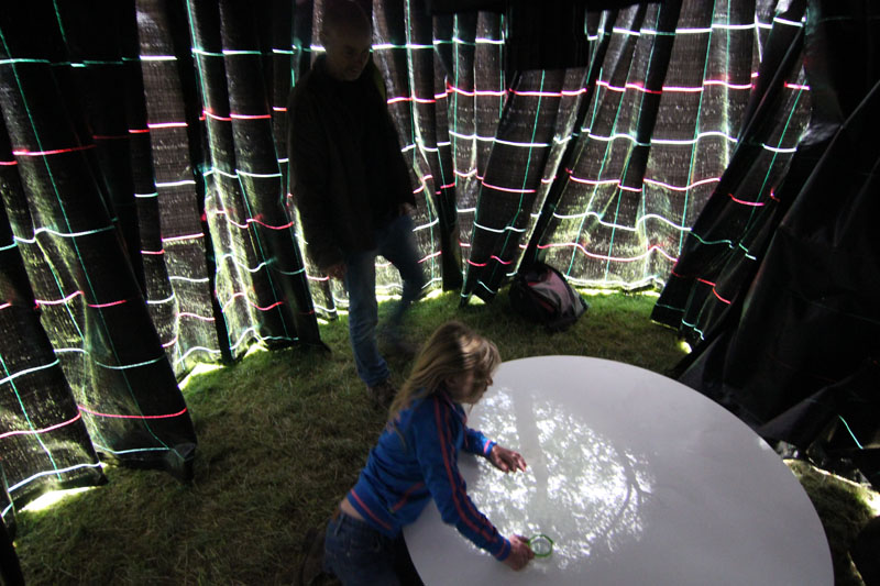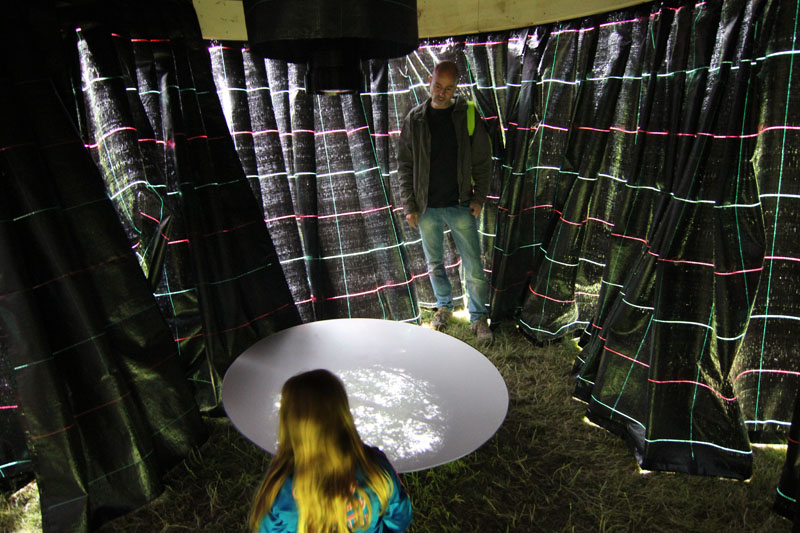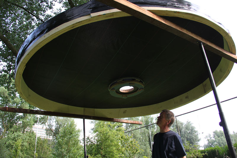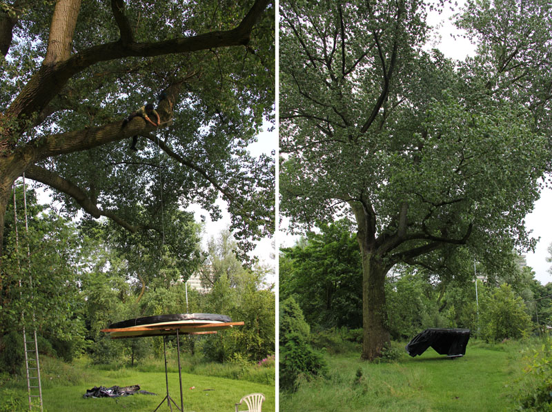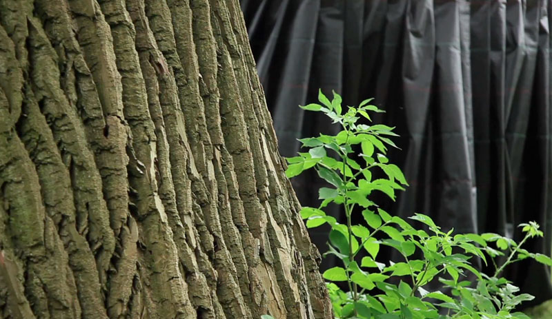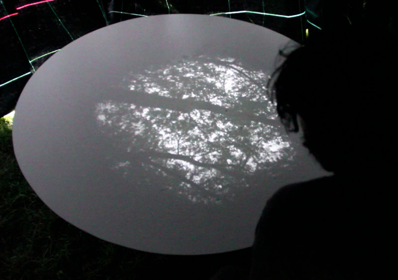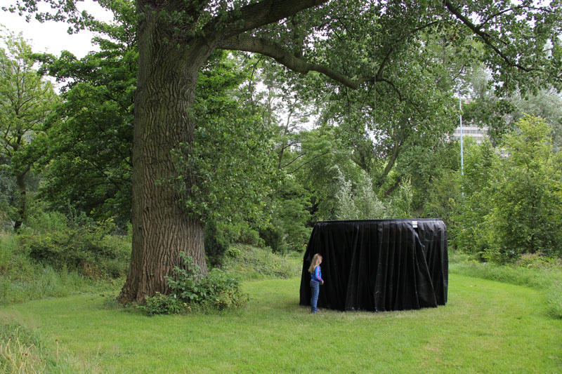 In een donkere-kamerconstructie, hangend aan een tak van de grote Canadese populier bij het theehuis is een lens loodrecht naar boven gericht op de kruin van de boom. Door de wind veroorzaakte bewegingen van bladeren en takken en voorbijdrijvende wolken worden geprojecteerd op een ronde tafel. De wind speelt met de rok en ook de ruimte zelf beweegt en daarmee de lens. De kleurige lijnen van het worteldoek lichten op in de ruimte. Door aan het tafelblad te draaien kan men de focus van de lens verleggen. Het krakende geluid van het bewegende doek geeft een extra dimensie aan het werk.