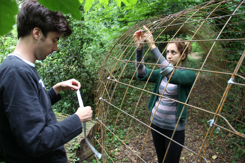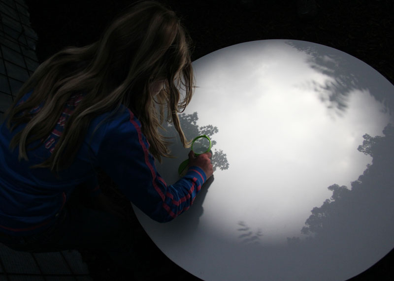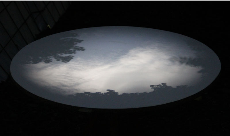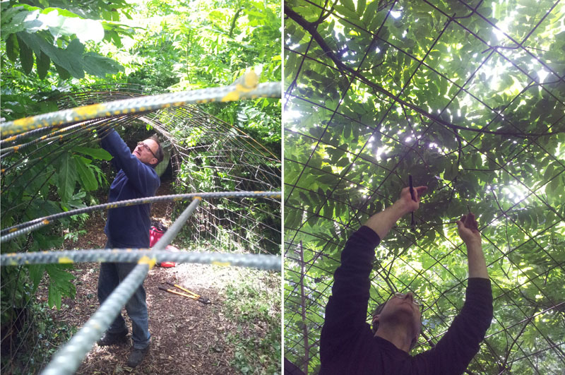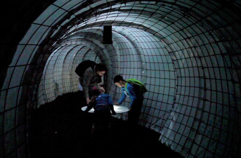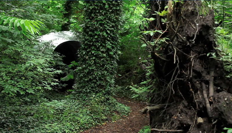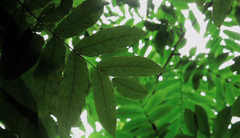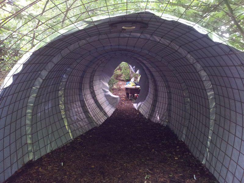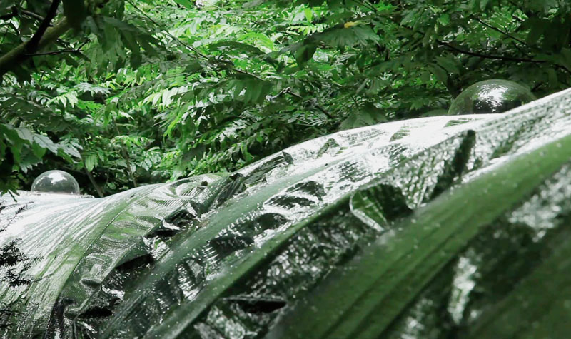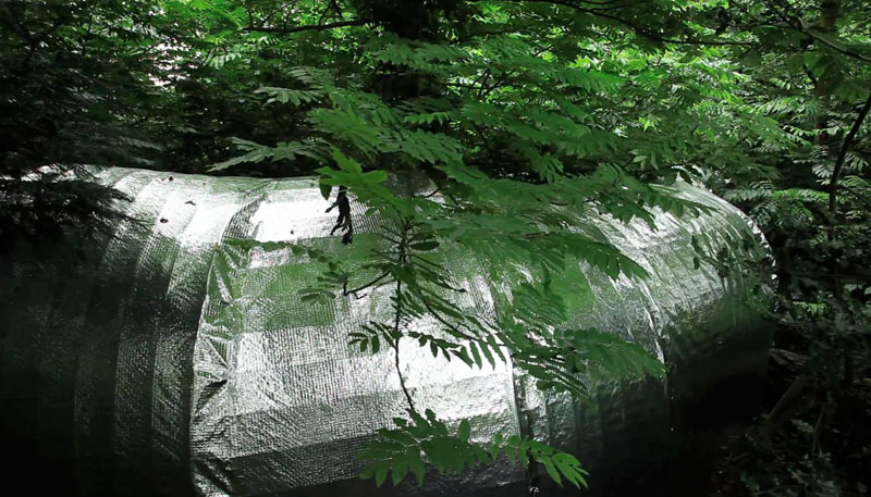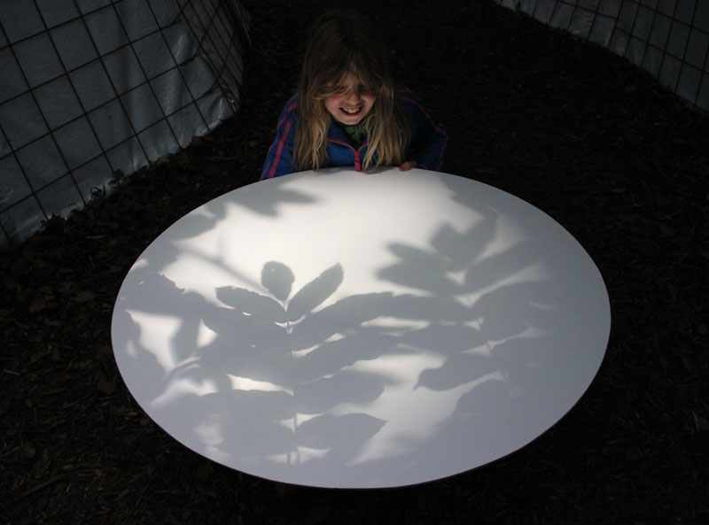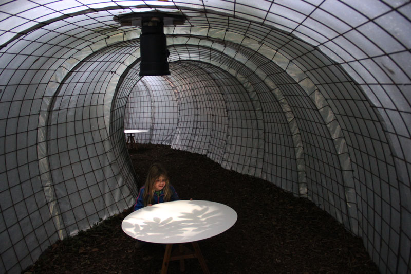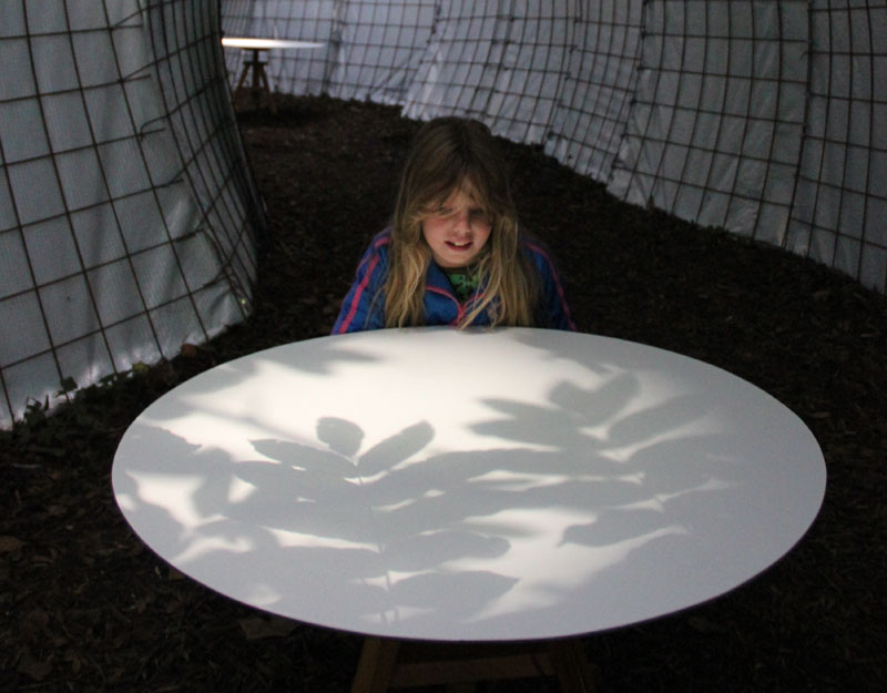 In een donkere-kamer tunnel, geplaatst tussen twee omgevallen vleugelnootbomen, zijn lenzen loodrecht naar boven gericht op dicht bijzijnde bladeren, de lucht en op omringende bomen. Door de wind veroorzaakte bewegingen van bladeren en takken en voorbijdrijvende wolken worden geprojecteerd op ronde tafels. De  tunnelsegmenten zijn omspannen met zilverkleurig folie dat spaarzaam het licht doorlaat. Schaduwen van de bladeren worden geprojecteerd op het doek. Vallende bladeren op de folie zullen in de herfst de constructie steeds meer gaan bedekken.