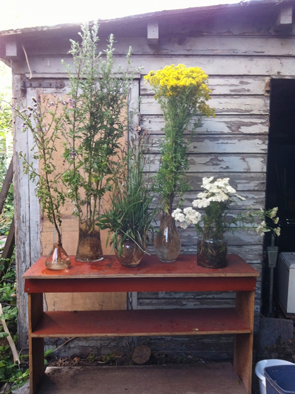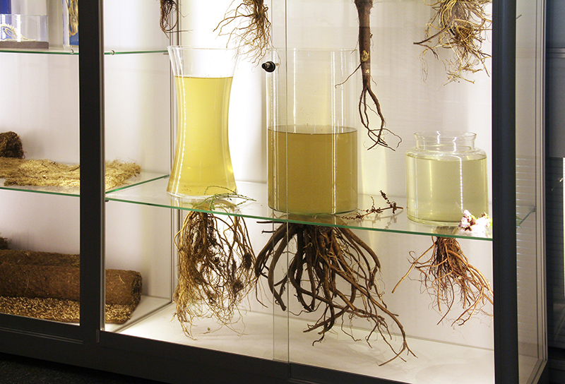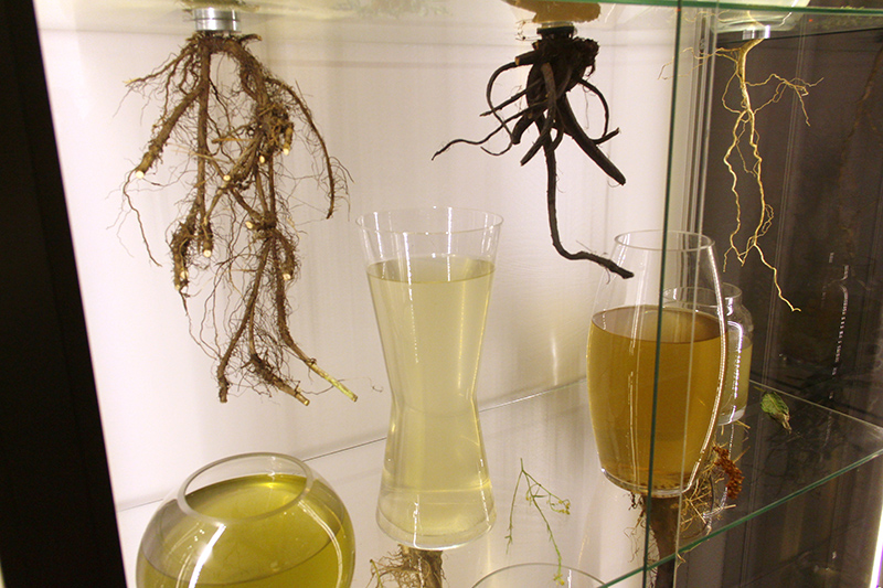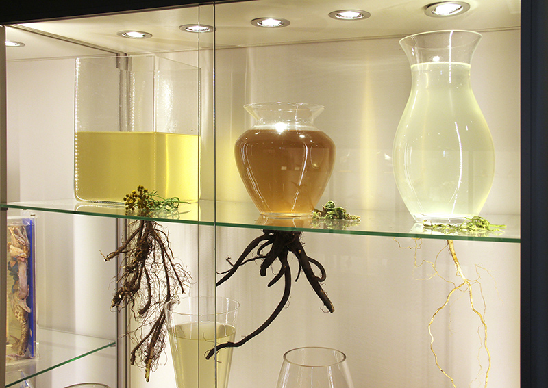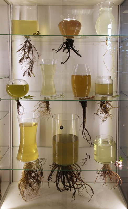 The vazes with the root extracts were placed on glass shelves, the roots were attached under the vazes.