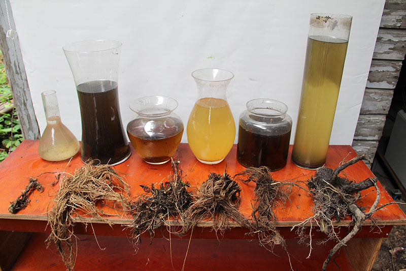Na enkele weken bleken de verschillende planten(wortels) het water waar ze in stonden een andere kleuring te geven.