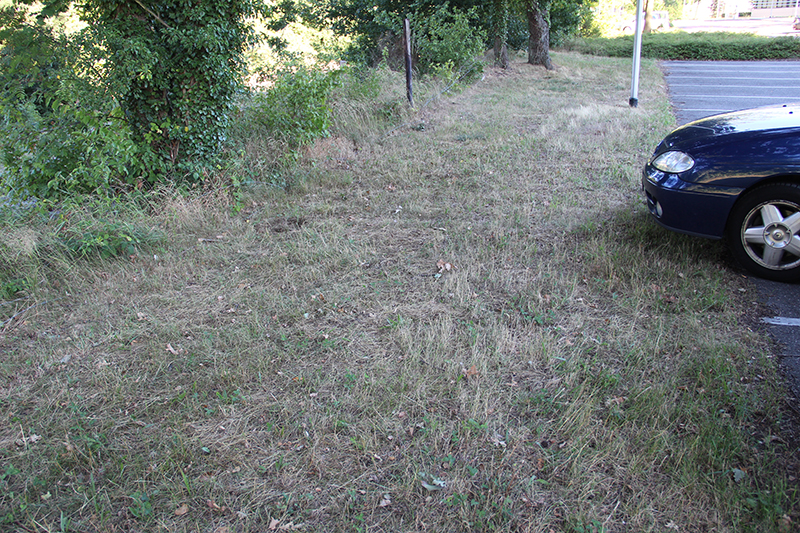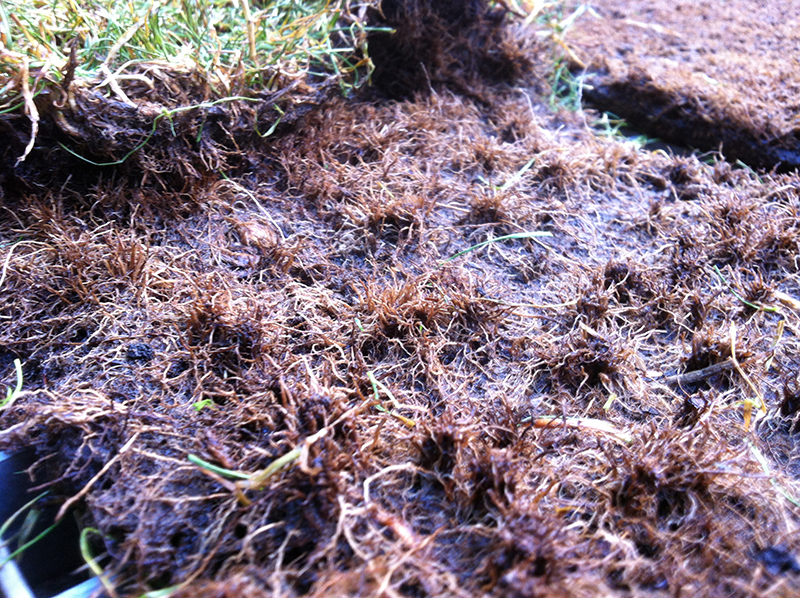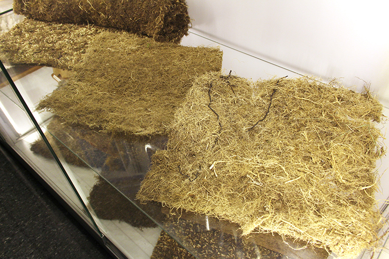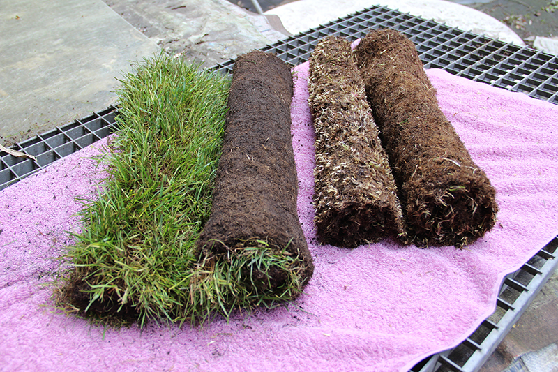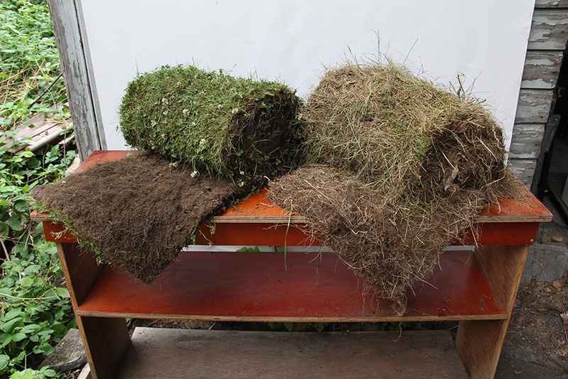 Bij het velddonderzoek werd ook het terrein van de universiteit betrokken. Hier ging om te beginnen het grasveld op de schop. Op verschillende plekken werden gras/plantzoden gestoken. Met knippen, kloppen, wassen , drogen en scheren werden de zoden omgevormd tot textiel. Ook verschillende gekochte graszoden werden op deze wijze onderzocht. De variëteit in dikte en in dichtheid is enorm.